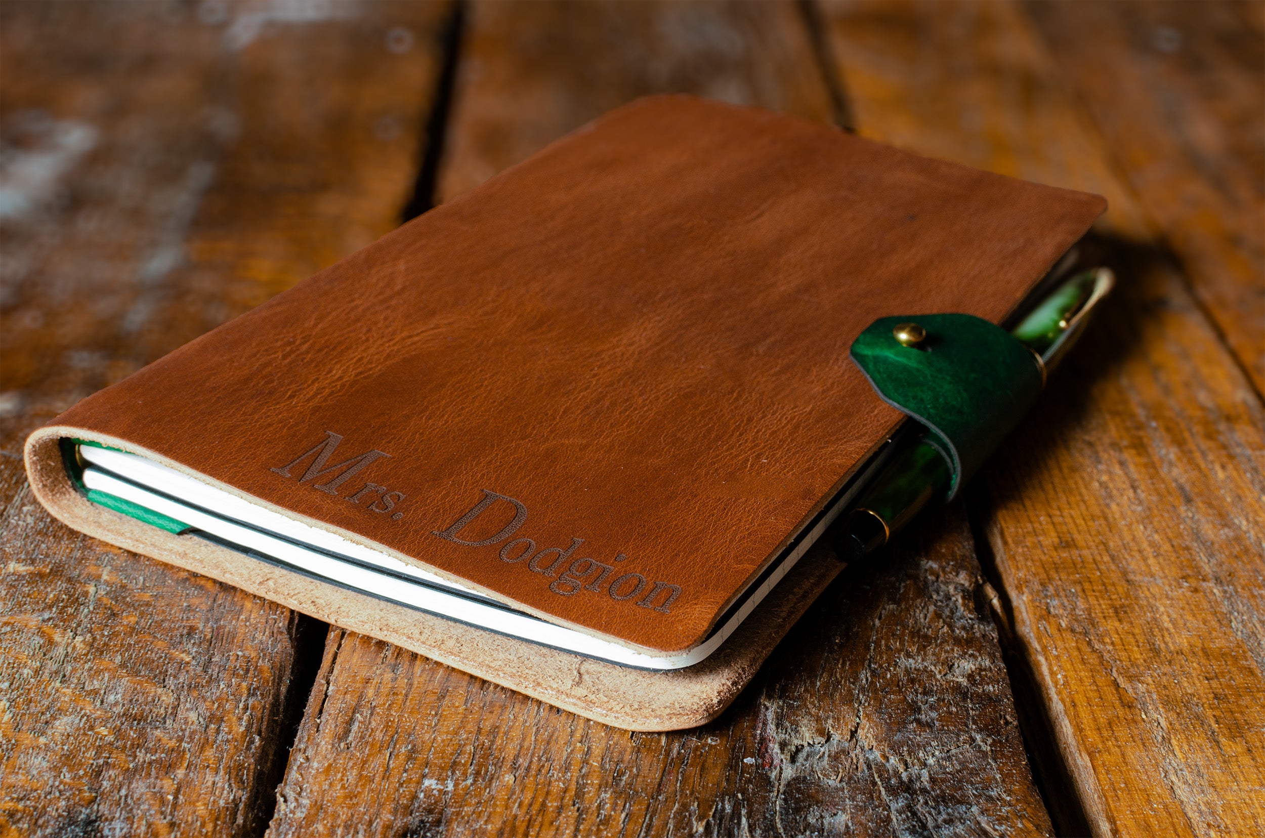 The same dimensions as our minimalist notebook cover The Slip, but with an added pen slot/bookmark tab along the side. Pen slot is sized to fit our favorite little pen, the versatile Fisher Space pen, though the majority of standard sized pens will fit. We've even had a Sharpie in there.