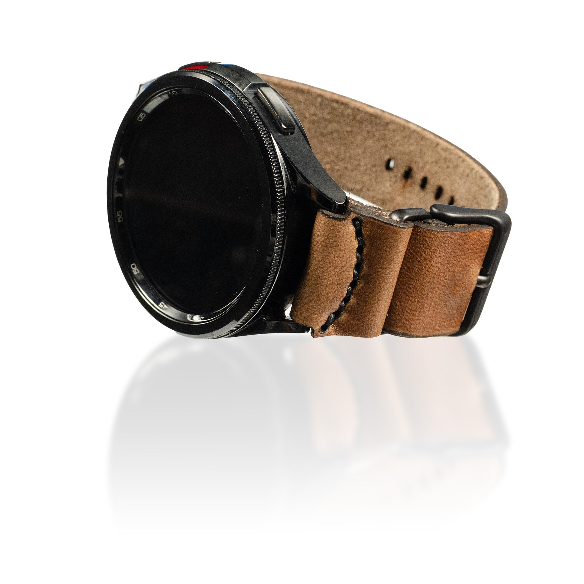 We took our signature closure-on-the-side-of-your-wrist-so-it's-super-comfortable (because it doesn't bang against your laptop or dig into the bottom of your wrist) design concept originally found in our button-stud watchband and meticulously adjusted the dimensions and design to work with standard watch buckles and complement the clean lines of the Samsung Galaxy Watch.