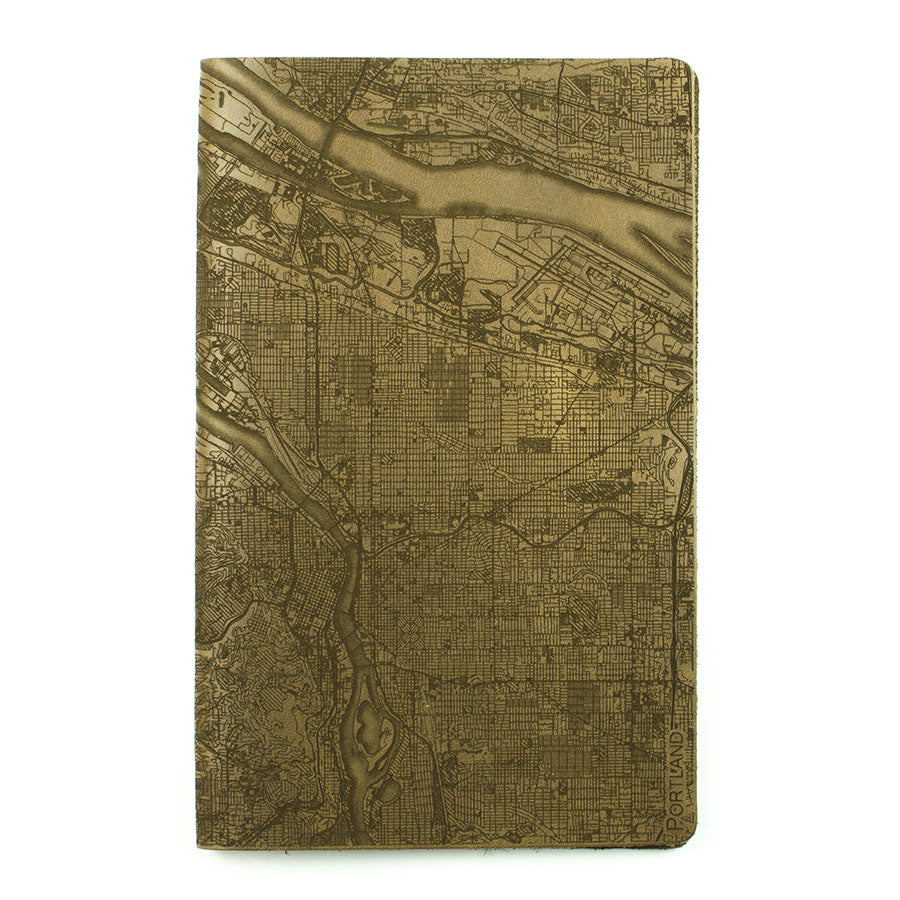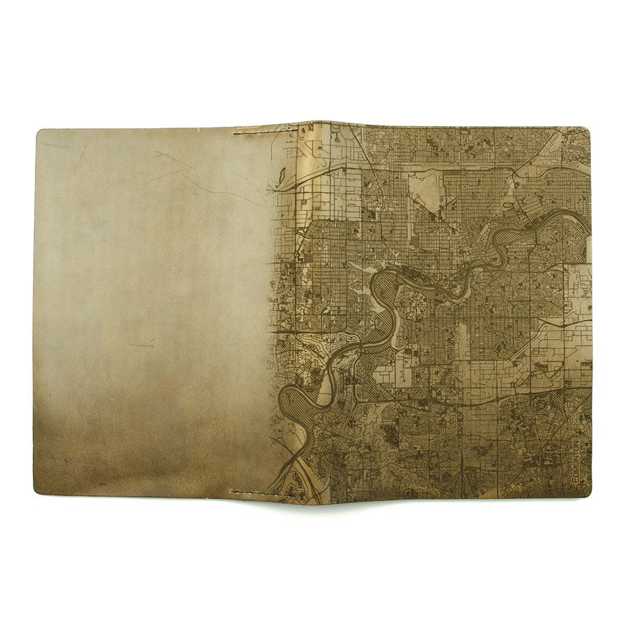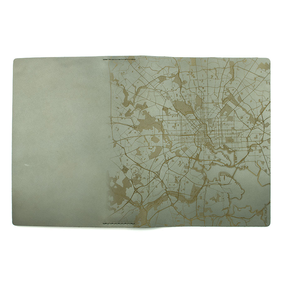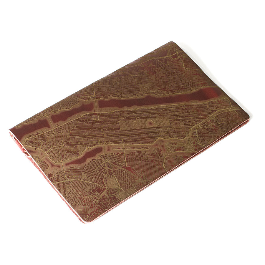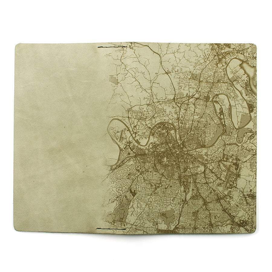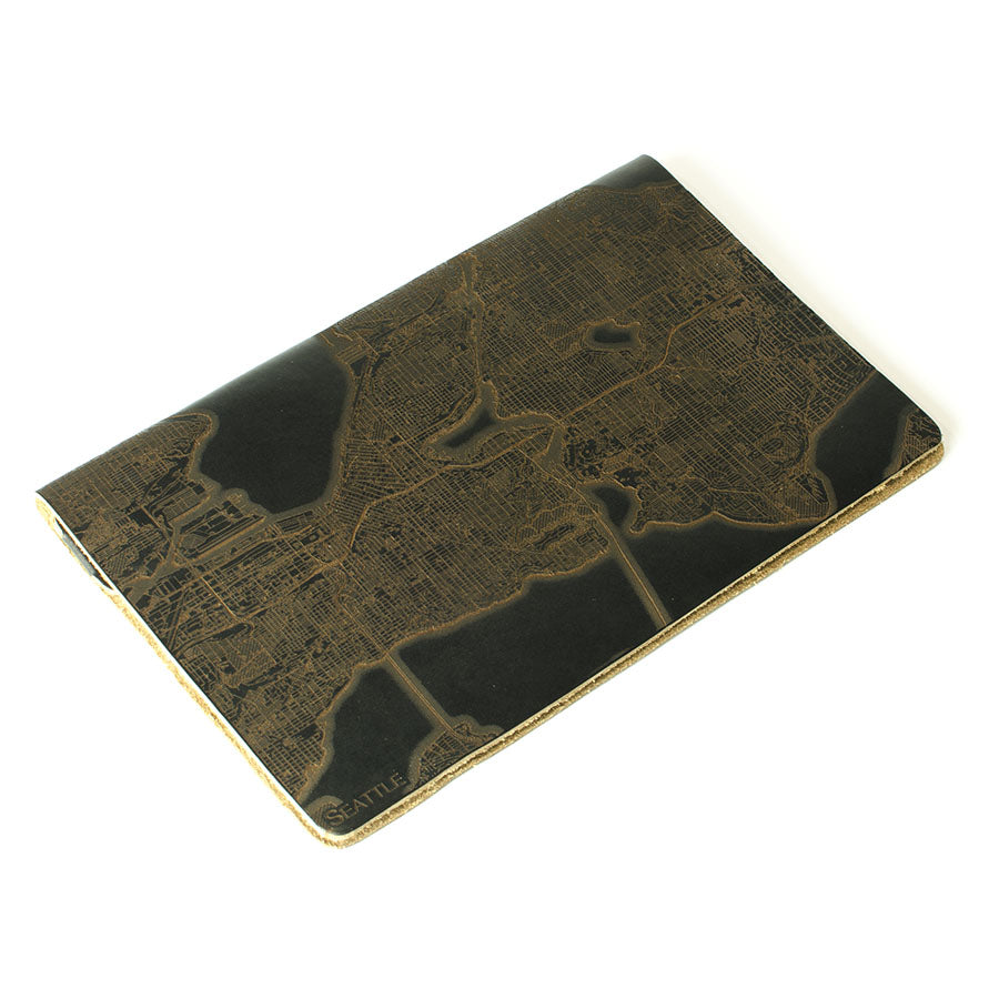 Map is laser engraved on the entire front cover, wraps spine, and fades out on the rear cover. North is always up because we're not anarchists.