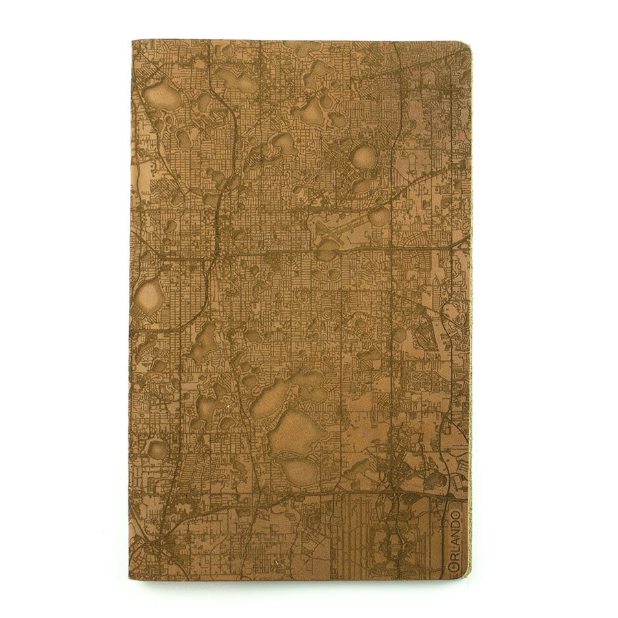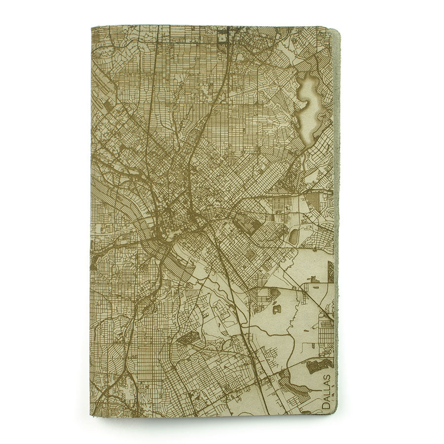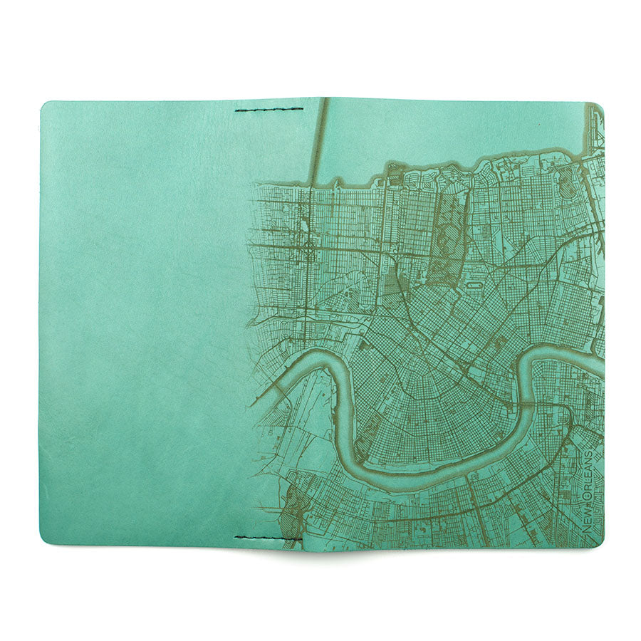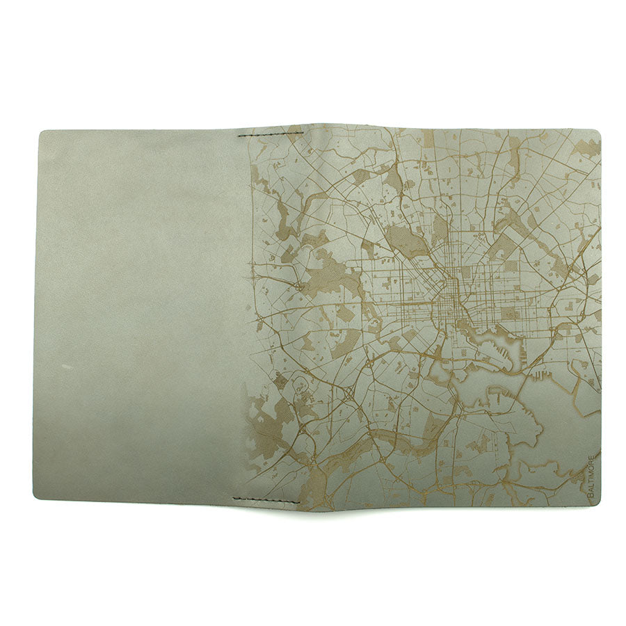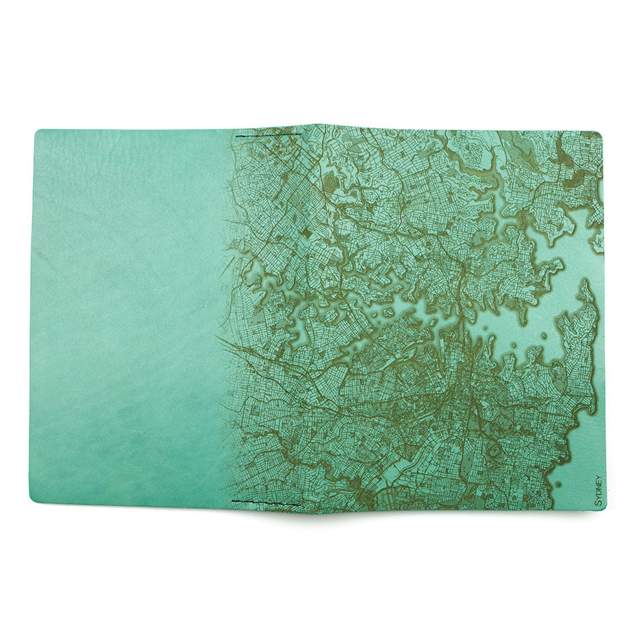 Map is laser engraved on the entire front cover, wraps spine, and fades out on the rear cover. North is always up because we're not anarchists.