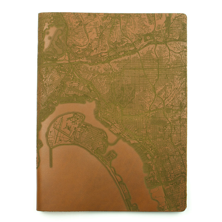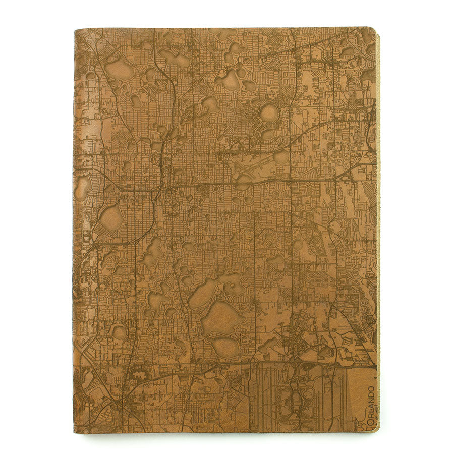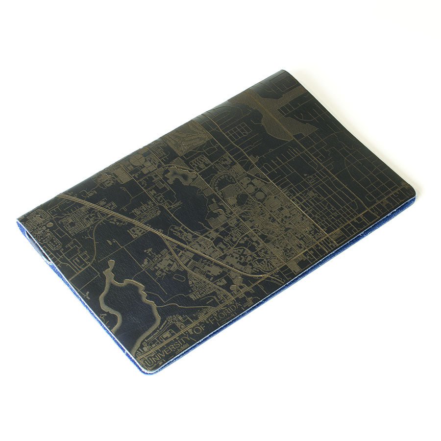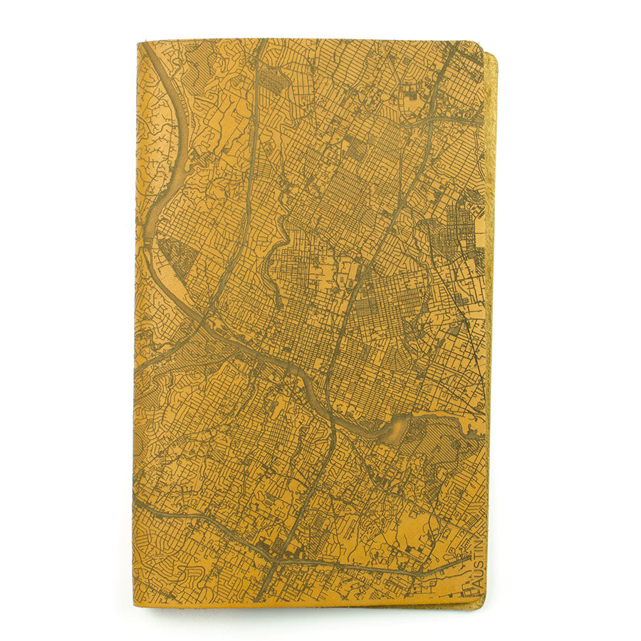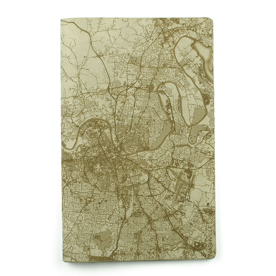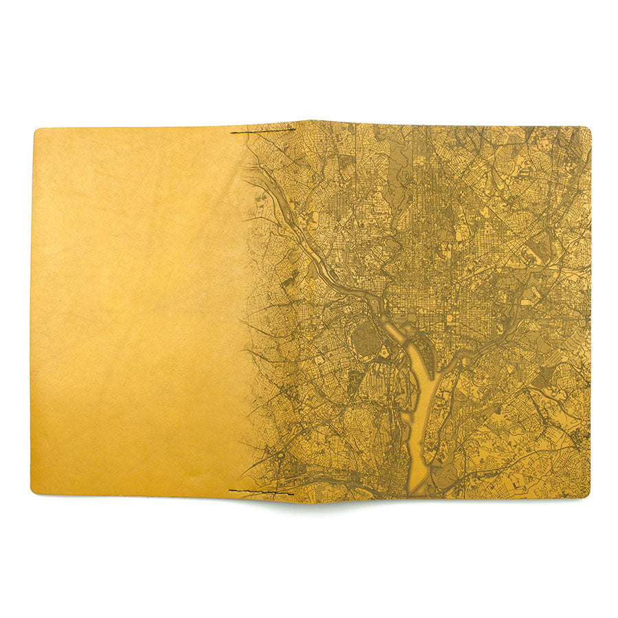 Map is laser engraved on the entire front cover, wraps spine, and fades out on the rear cover. North is always up because we're not anarchists.