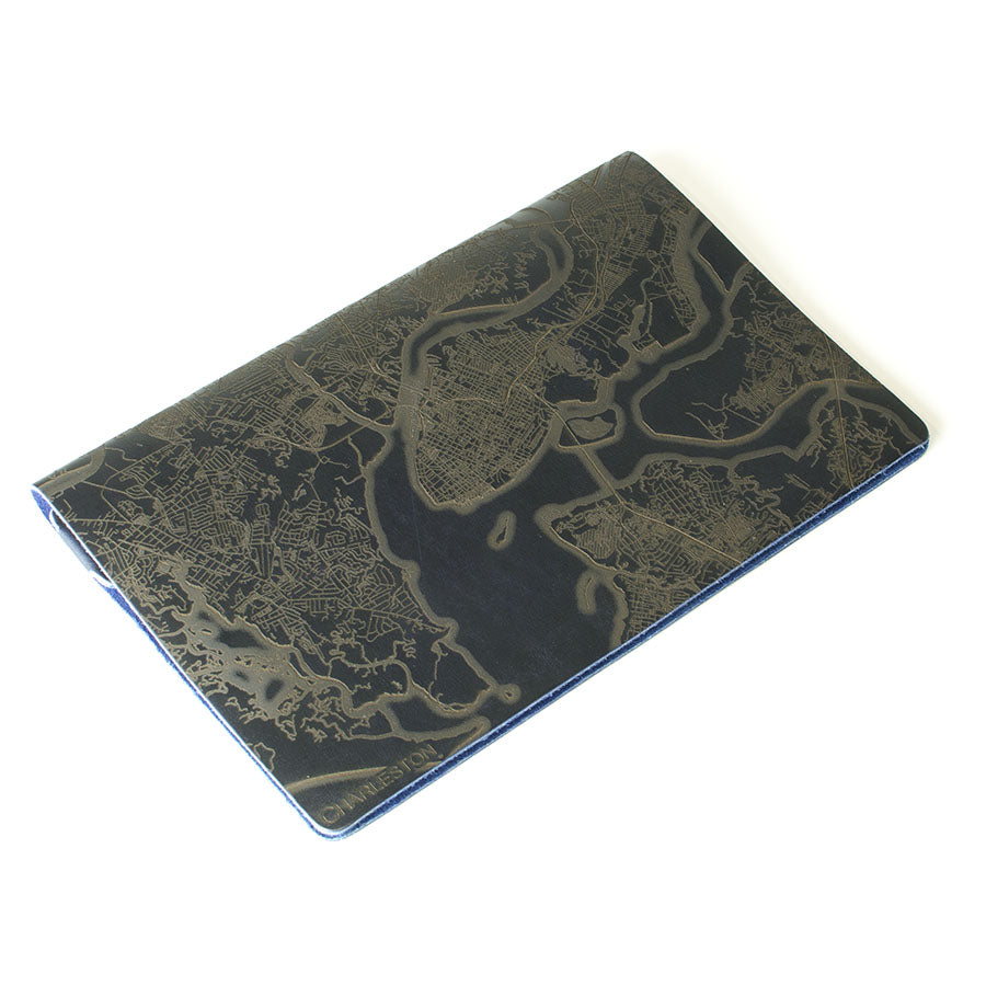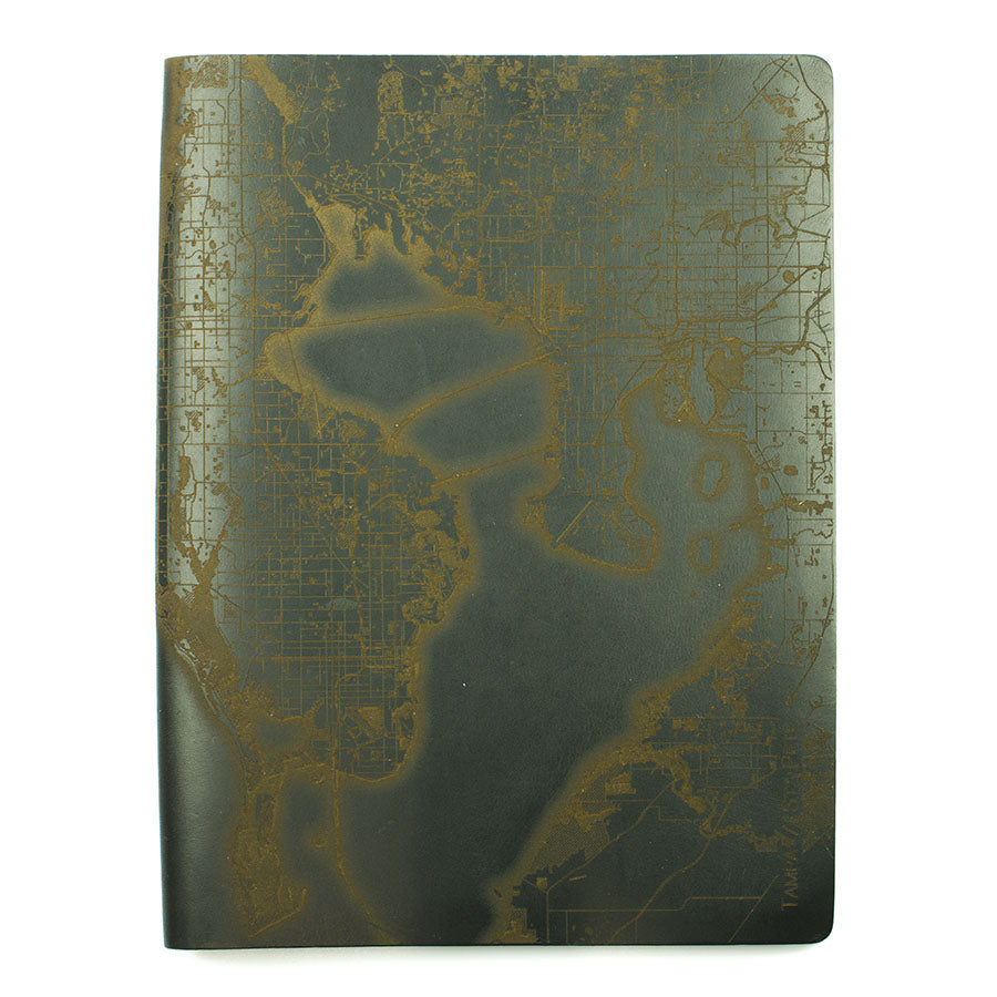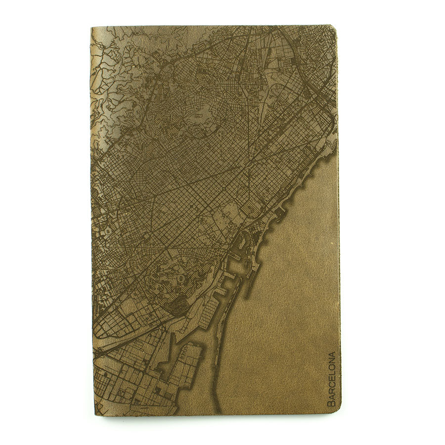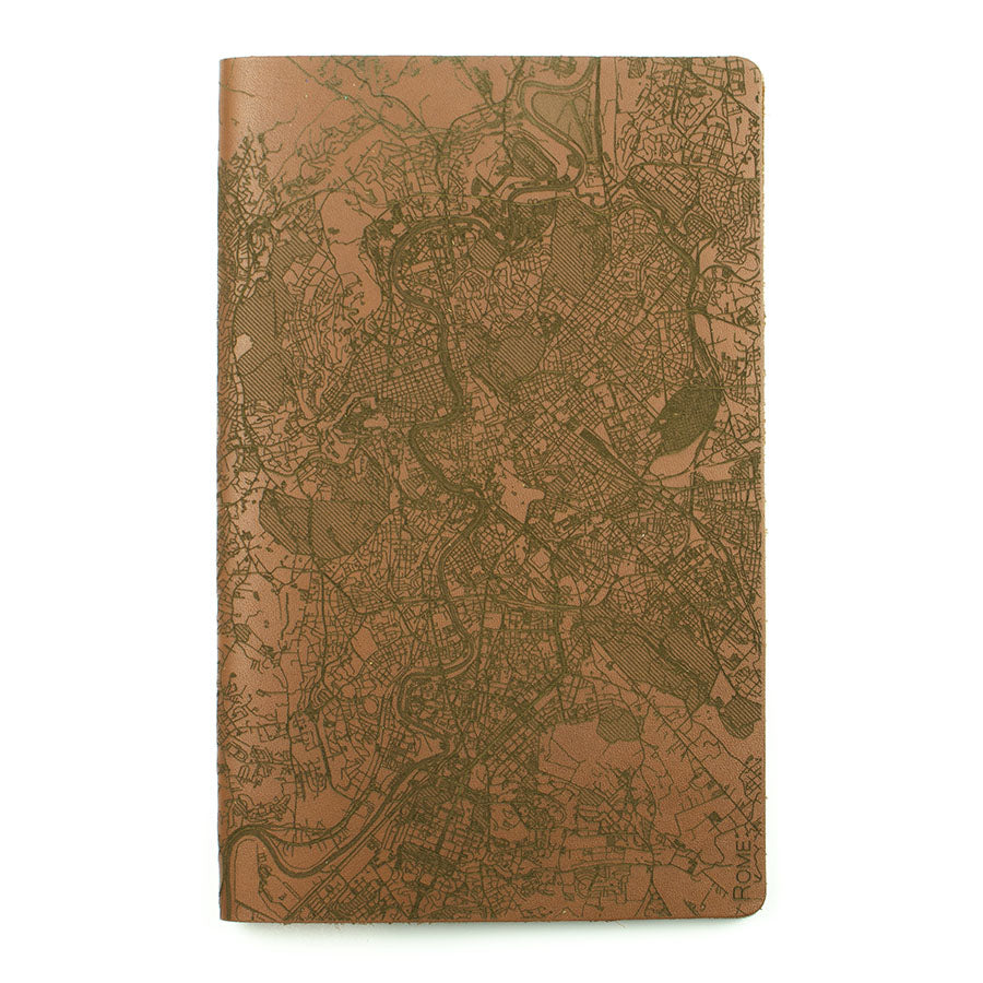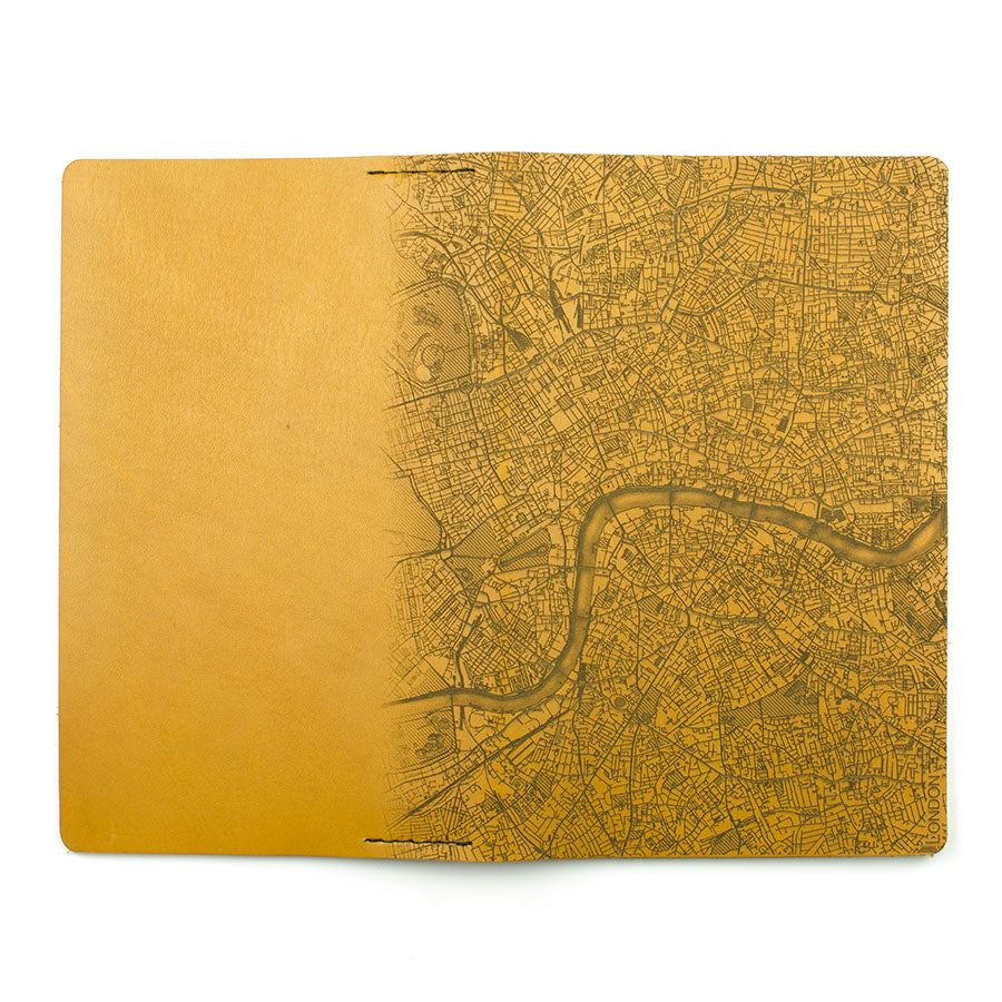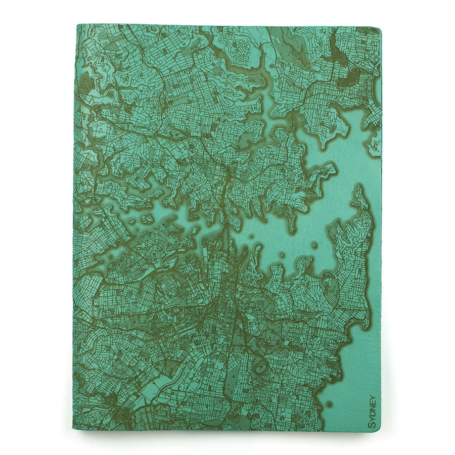 Map is laser engraved on the entire front cover, wraps spine, and fades out on the rear cover. North is always up because we're not anarchists.