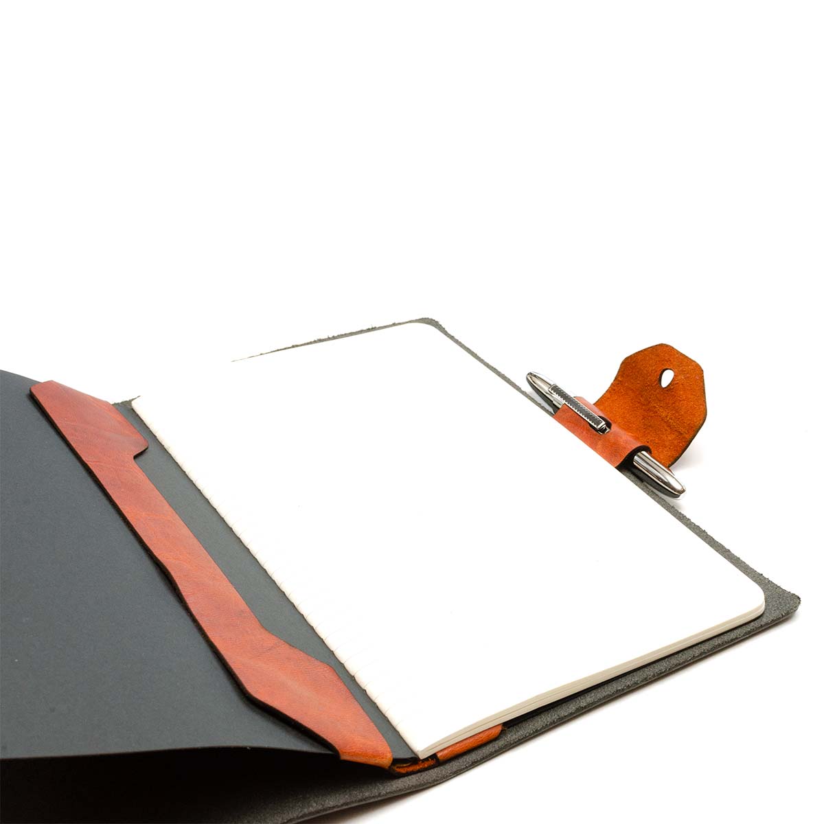 The same dimensions as our minimalist notebook cover The Slip, but with an added pen slot/bookmark tab along the side. Pen slot is sized to fit our favorite little pen, the versatile Fisher Space pen, though the majority of standard sized pens will fit.  We've even had a Sharpie in there.