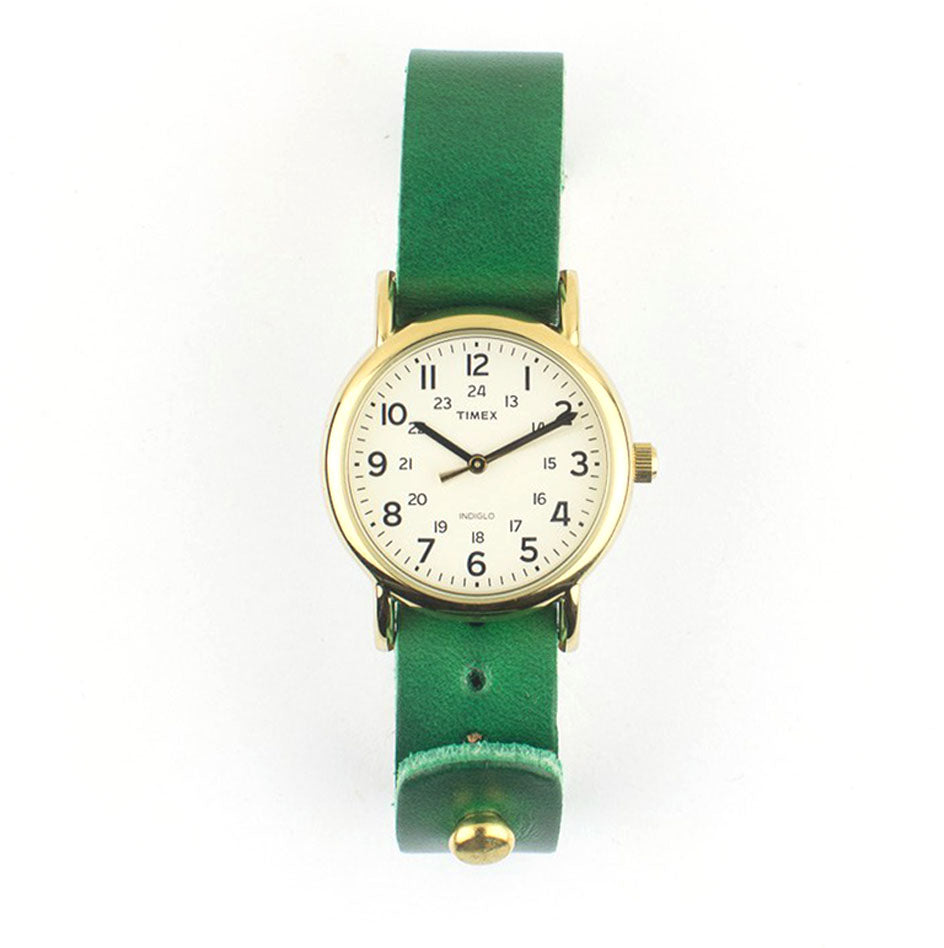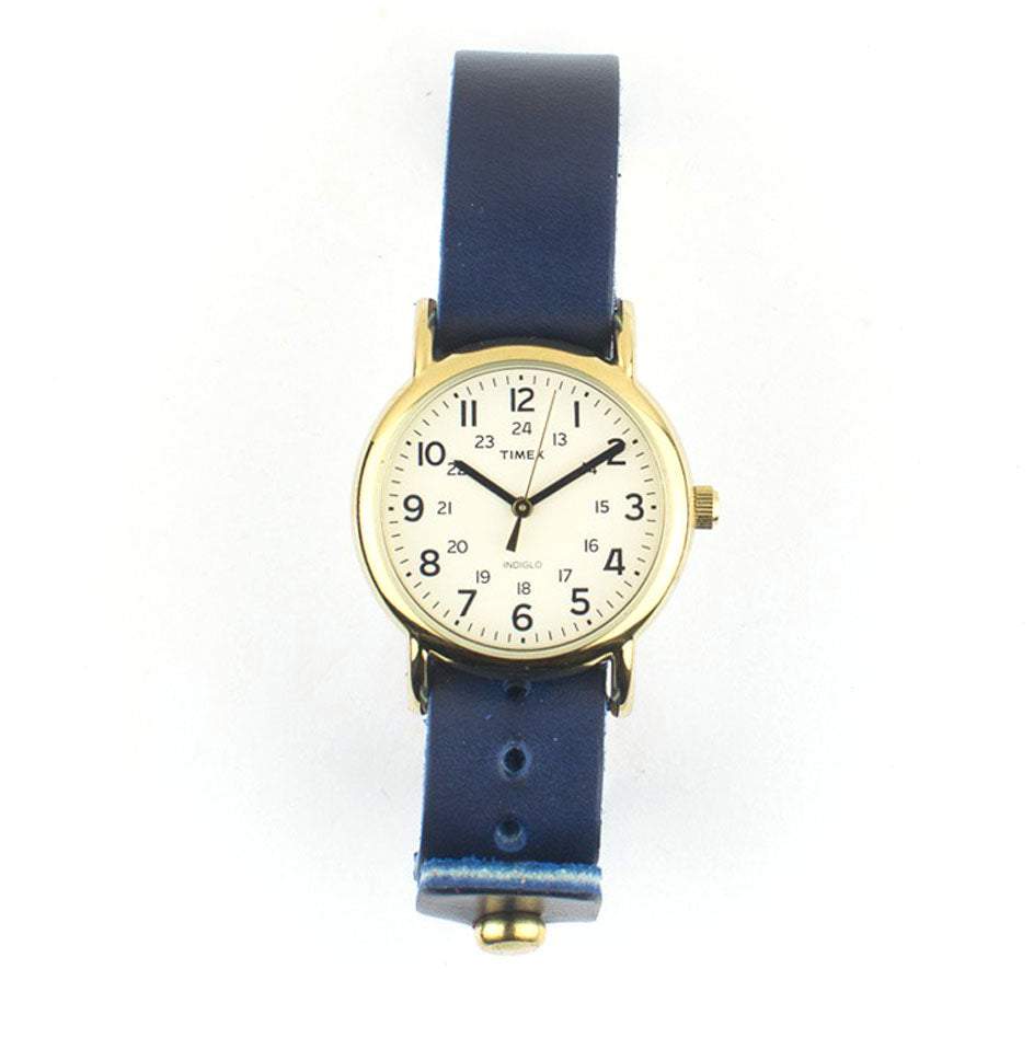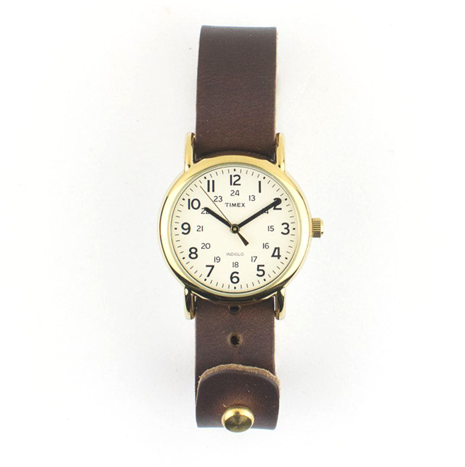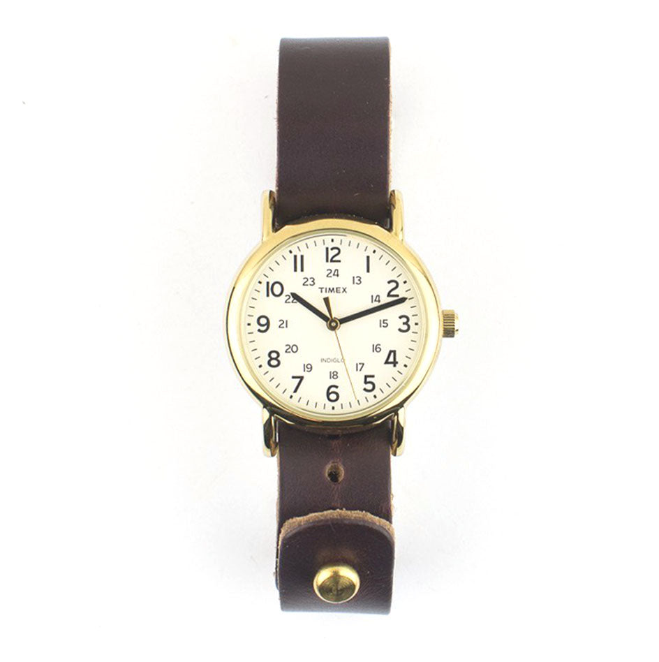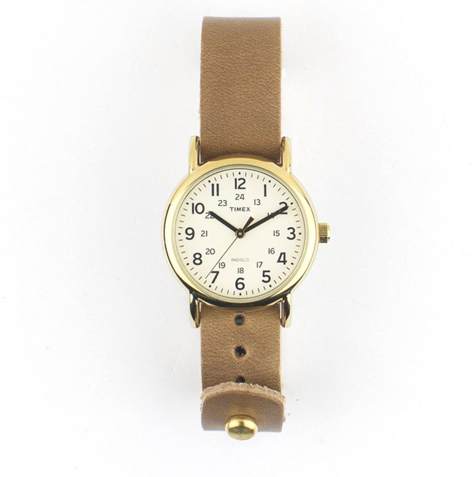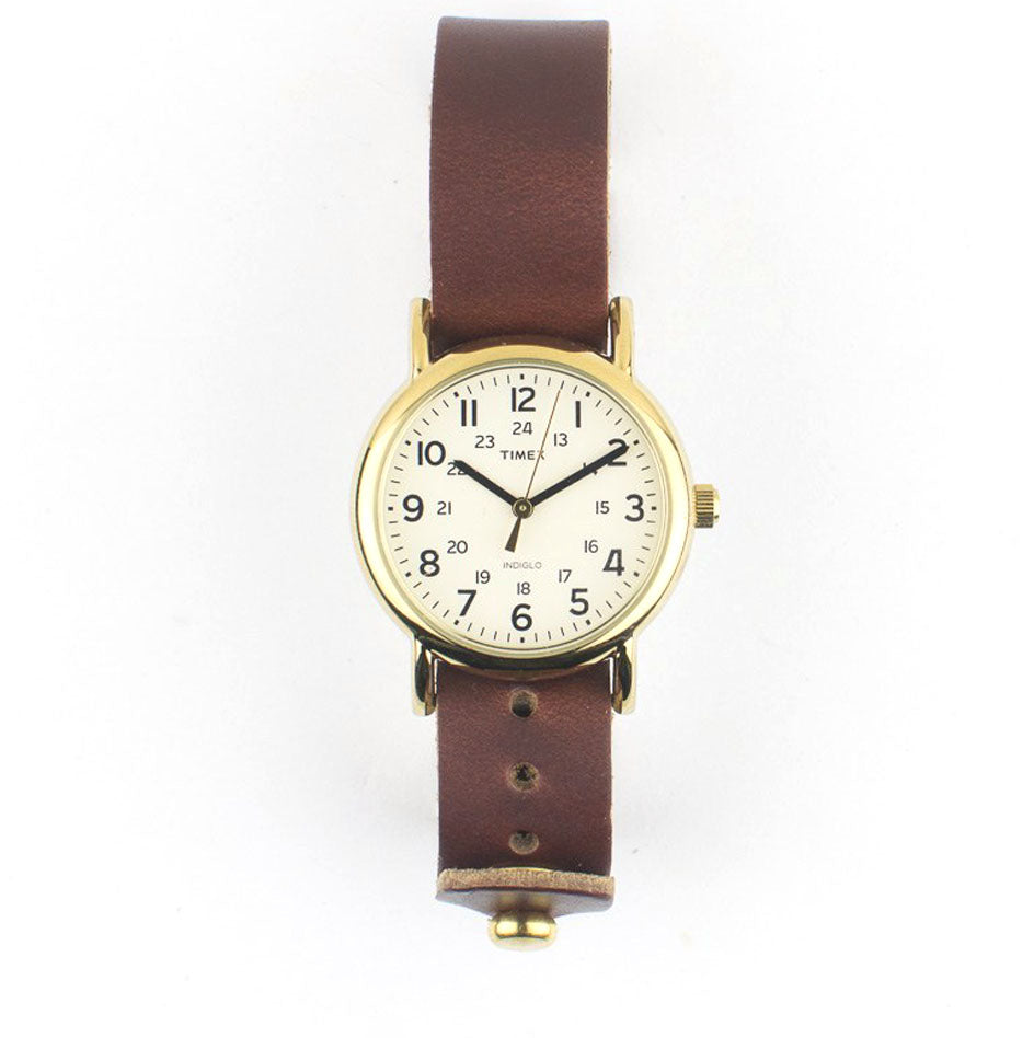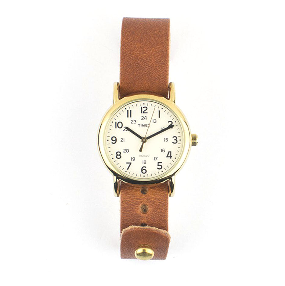 Button-Stud Weekender Mini combos selectively bundle this smaller watch face (a trim 31mm case diameter in classic brass) with our adjustable 16mm button-stud watchband in various shades of Horween leathers. All options include the original nylon Timex NATO band.