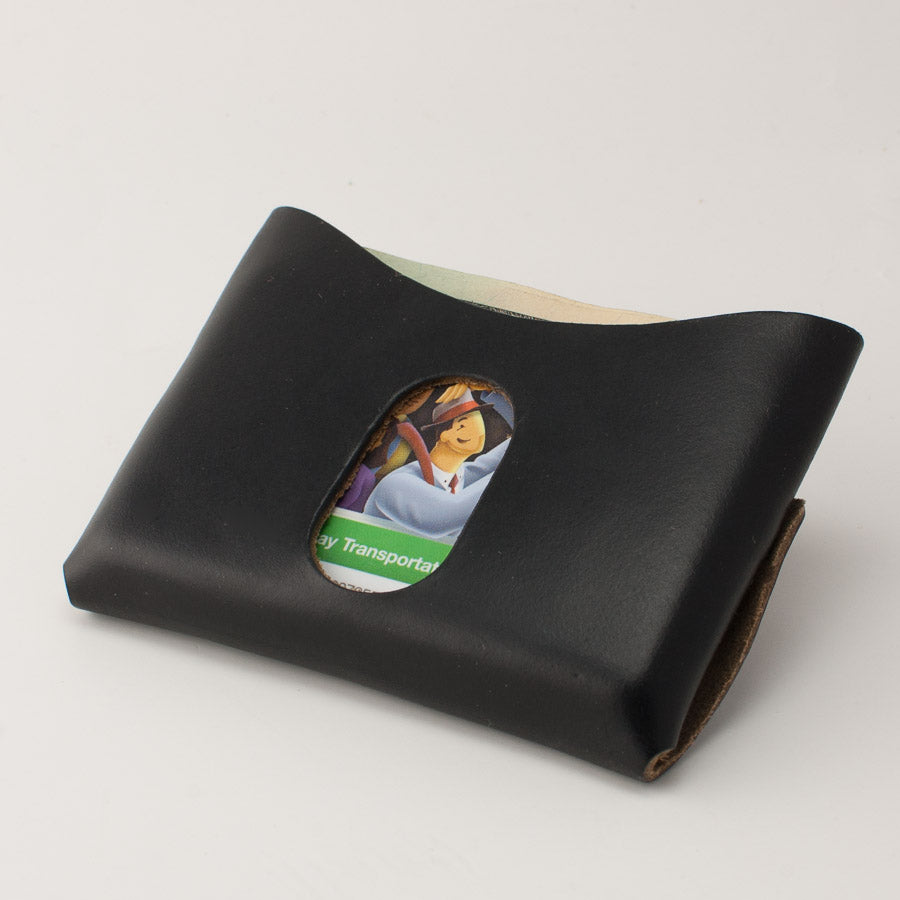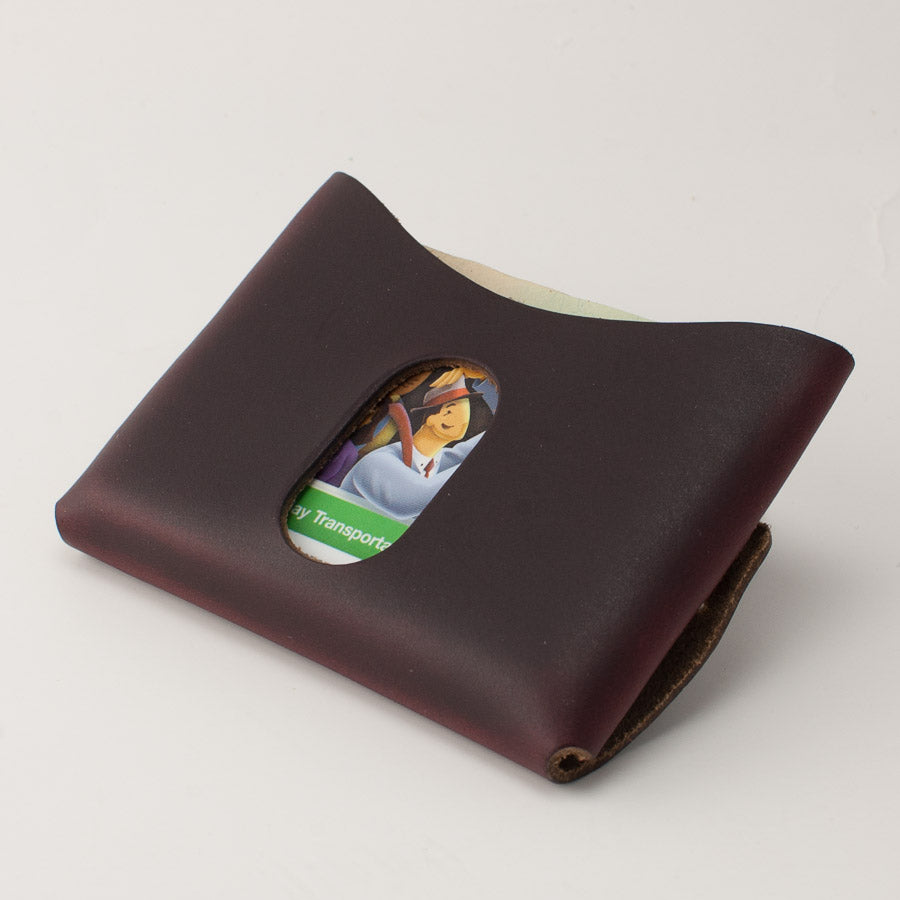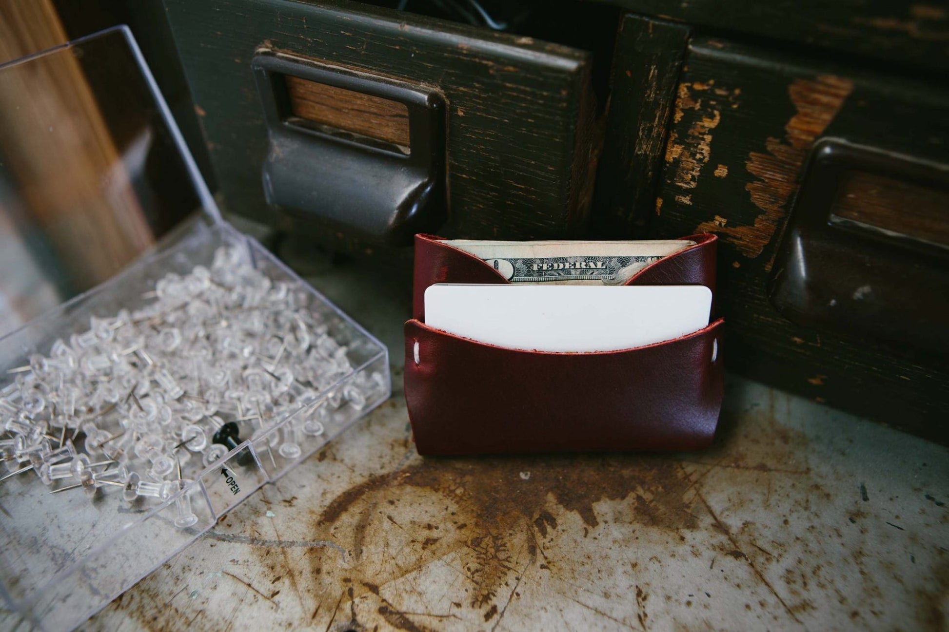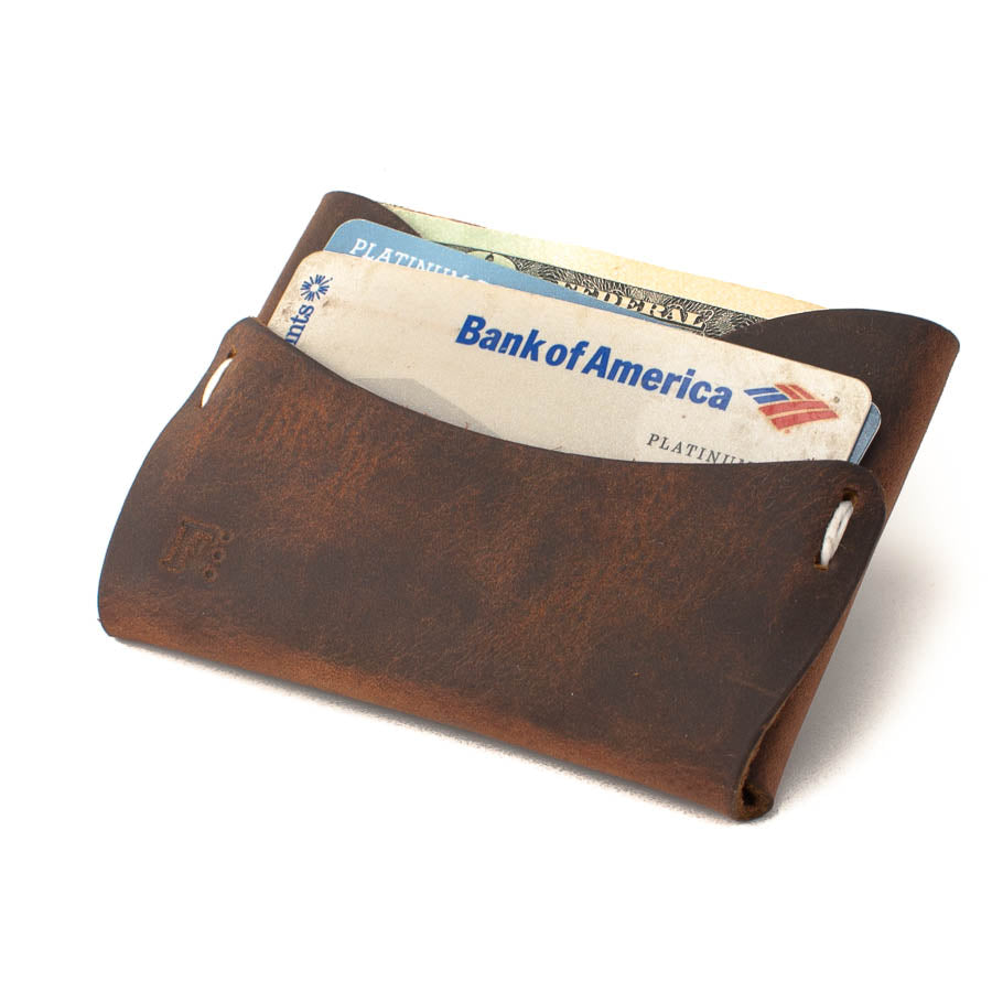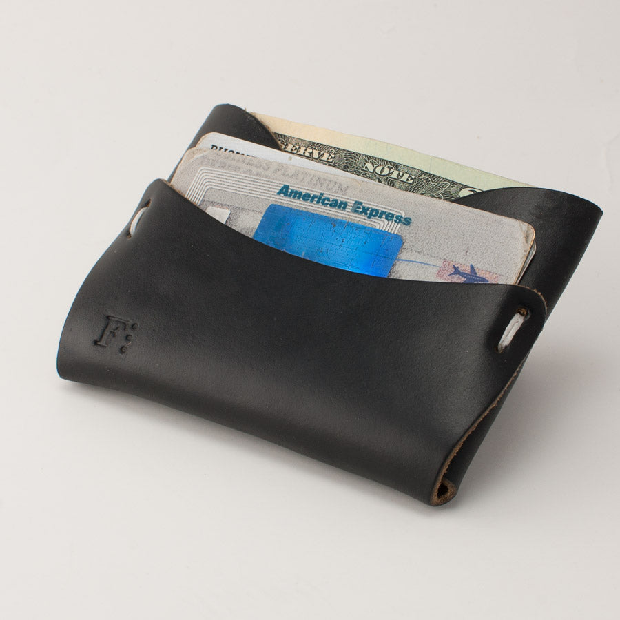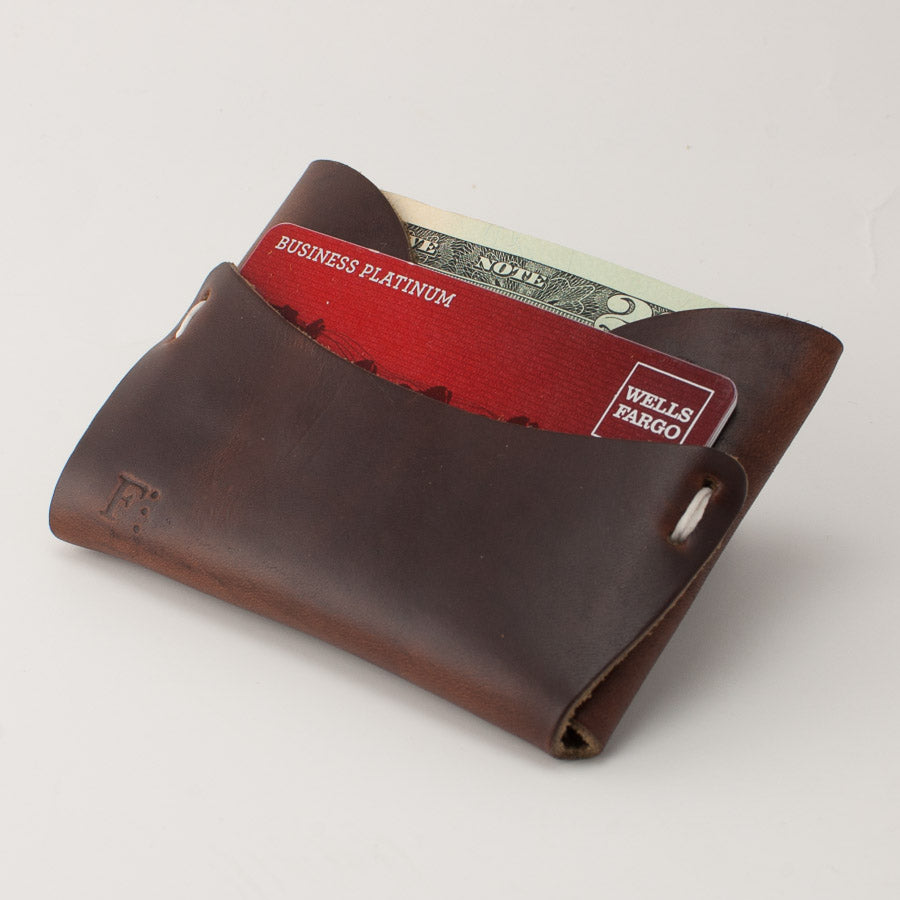 Two-pocket card case style wallet with extended 'tabs' along the side spines to cover cash. Rear thumb slot and space for 6-12 cards with two in the front slot and rest in the back alongside the cash. Single piece of full grain horween leather with a grand total of two stitches. Minimal as FFF.