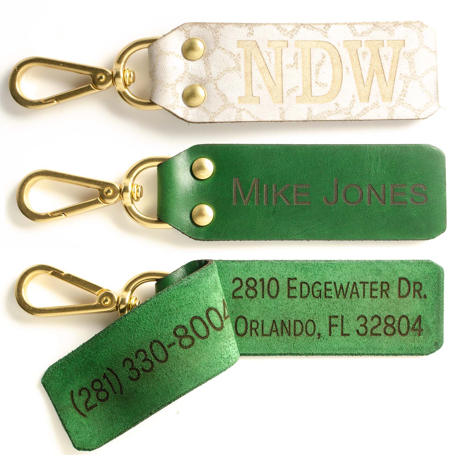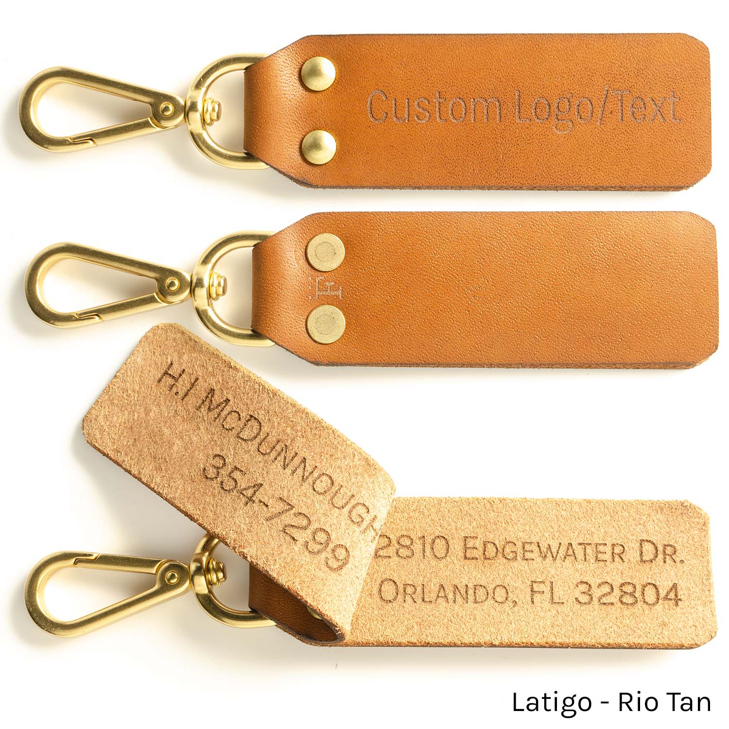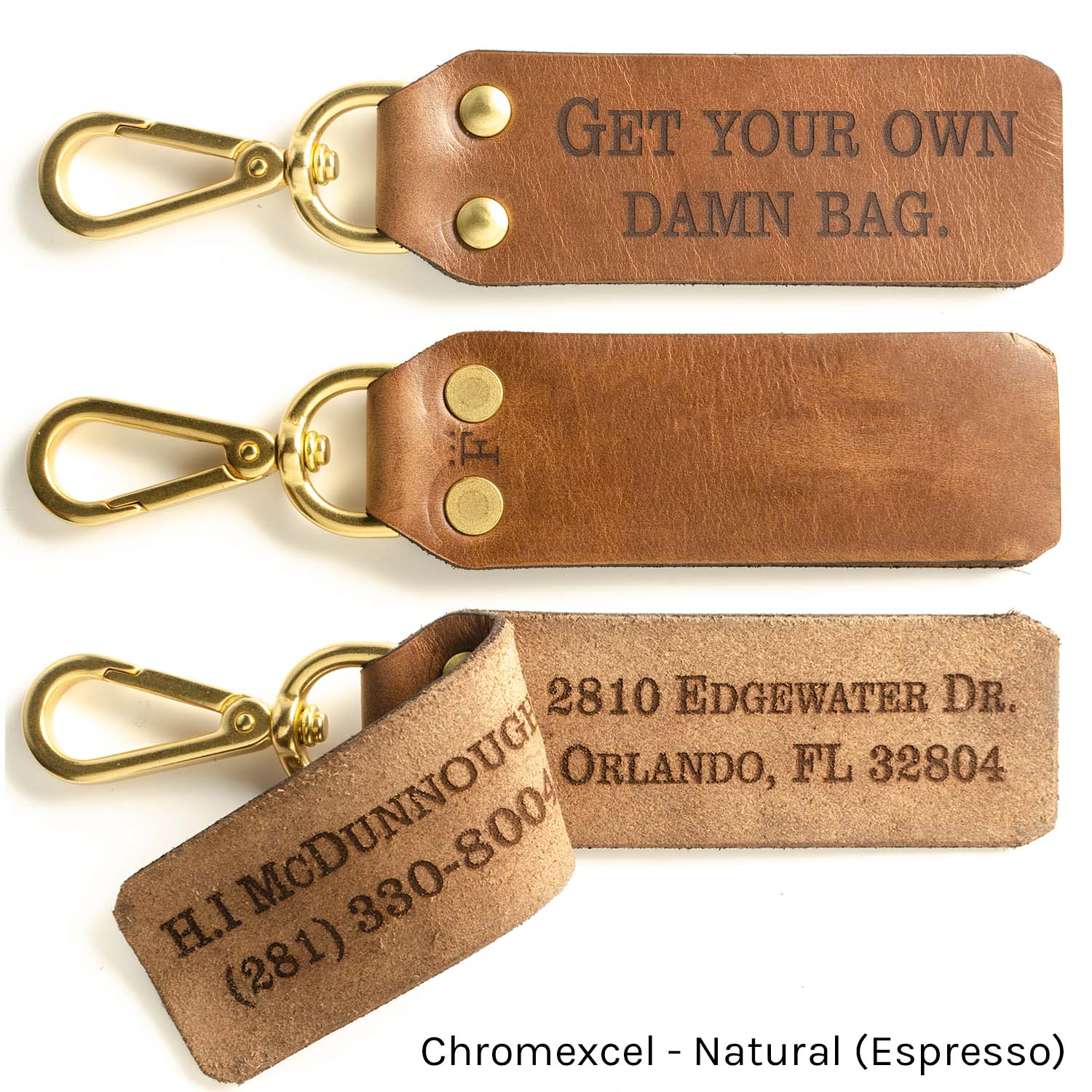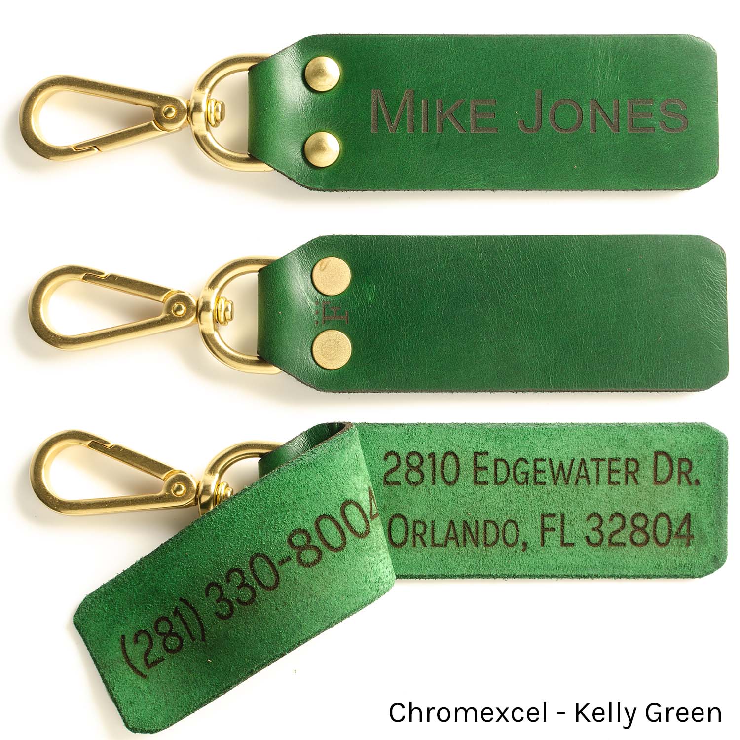 Clip attaches to exposed rings/straps on your luggage/golf bag/etc. (if your bag doesn't have exposed rings to clip to, see our strap loop design). Solid brass clip/rivets, contact information engraved inside flap so that creeper at the airport doesn’t get your address when you’re on your way out of town (typically we don't suggest engraving addresses on luggage...this isn't the 50s, nobody is going to bring you your bag, you're lucky if they'll email/text you, so no need to have your empty home advertised on your luggage).